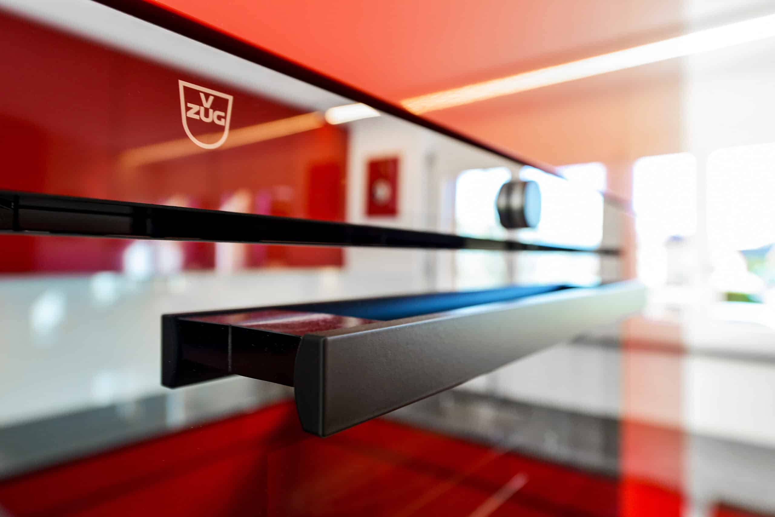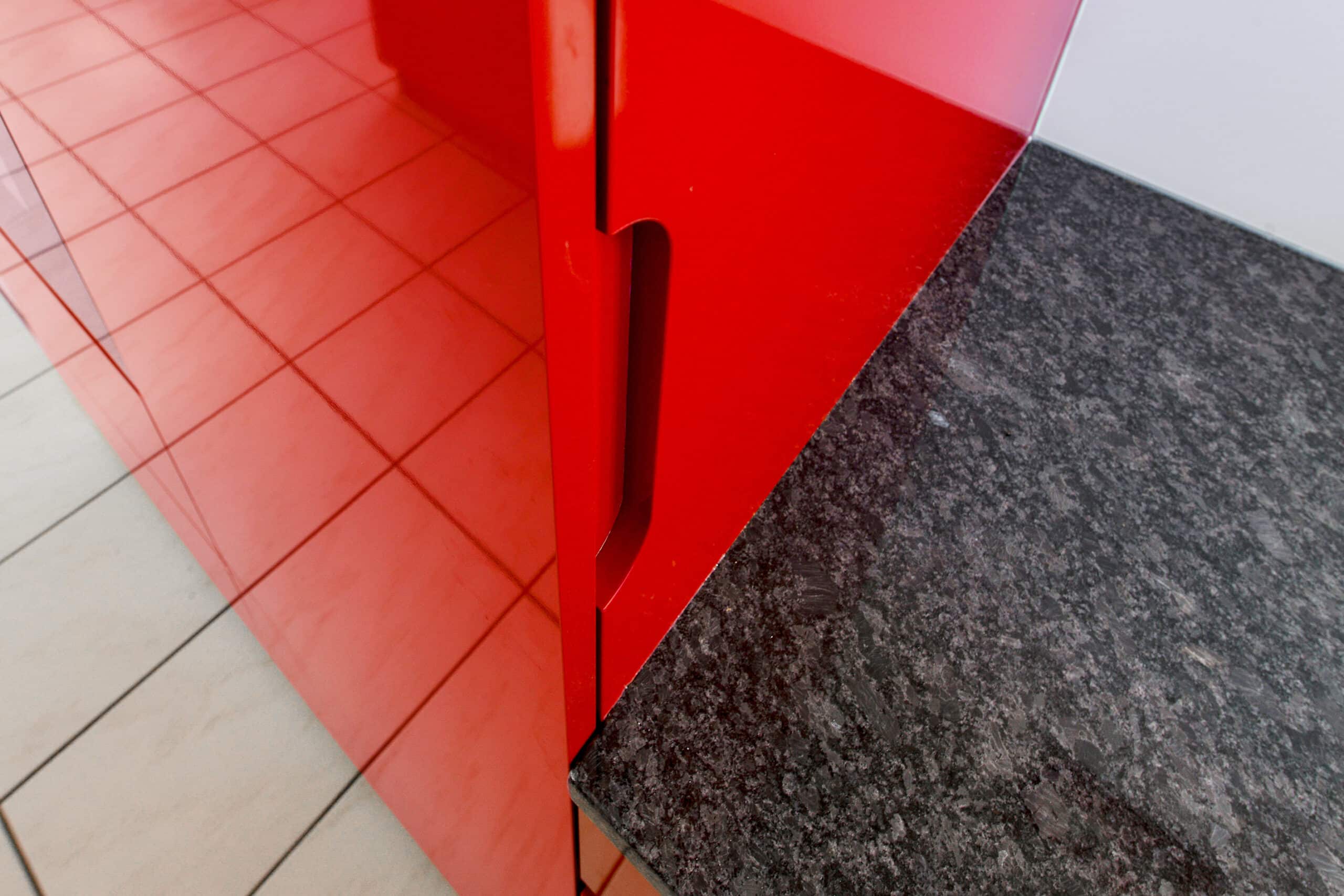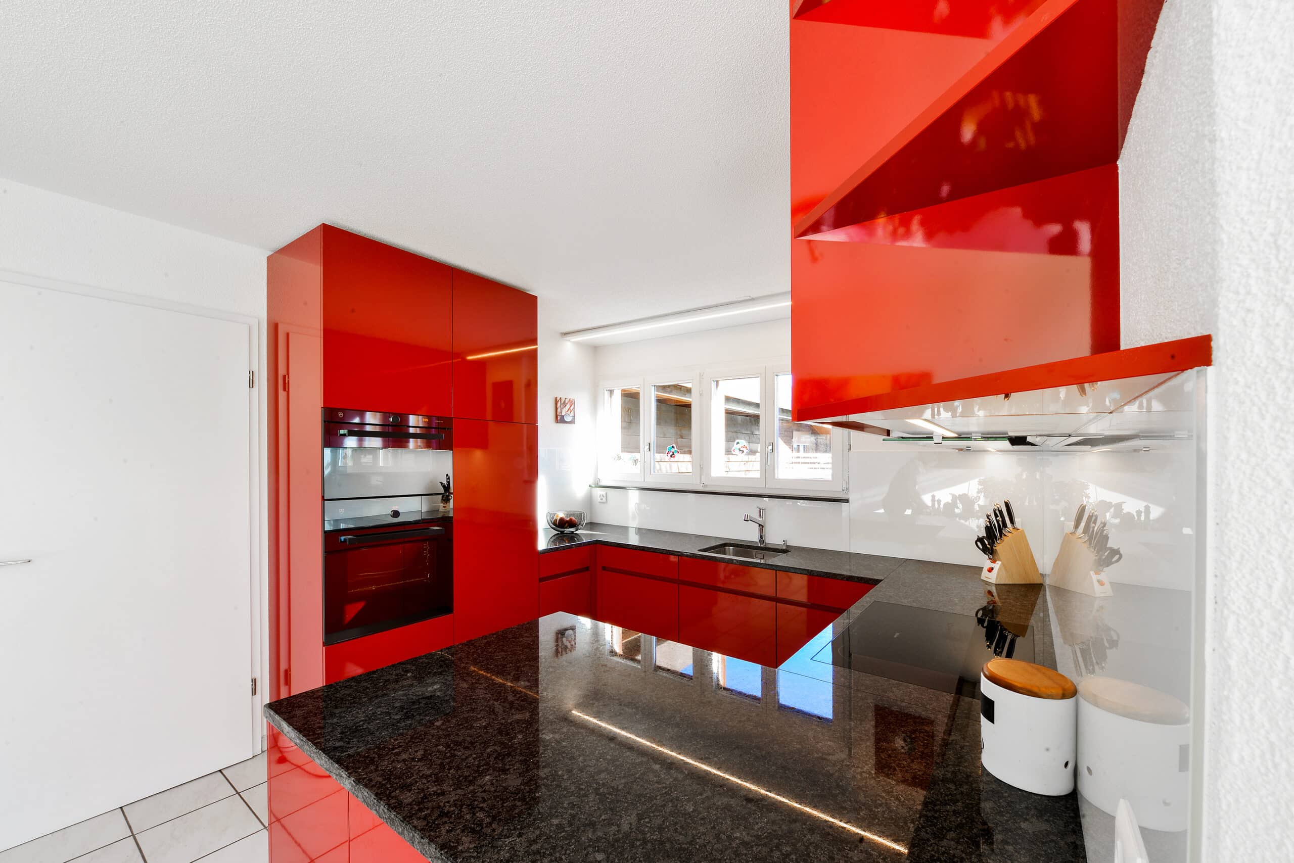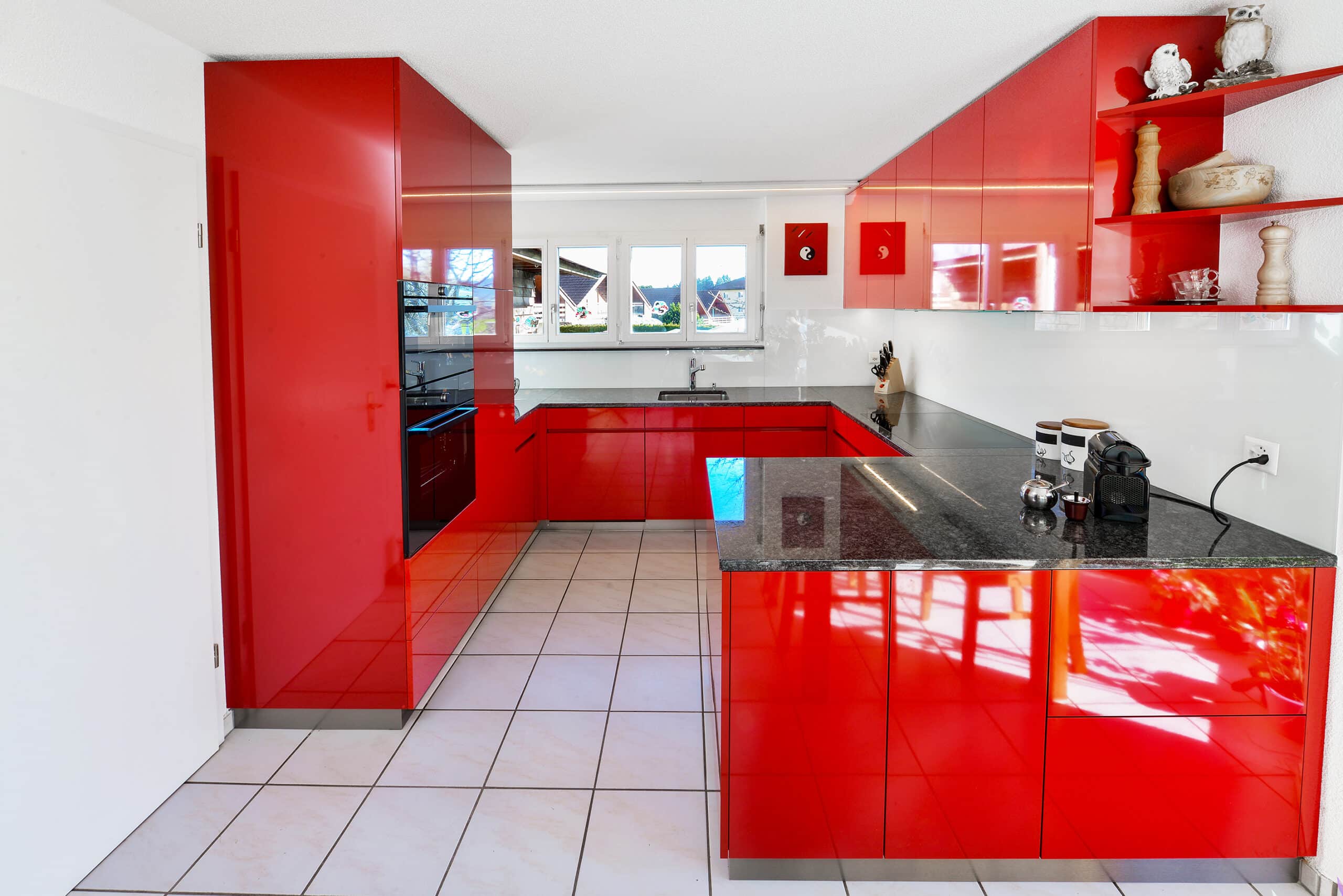 Cuisine rouge en U en haute brillance avec péninsule